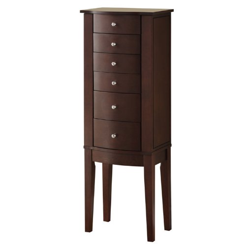 The 6-drawer "Merlot" Jewelry Armoire is a stylish addition to your bedroom furniture. Sleek yet functional, this jewelry organizer boasts a rich wood finish and plush back lining. Ample jewelry storage. Compact and practical storage solution. Top opens up for additional storage. Side doors open for hanging necklaces. Deep drawers. Assembly level/degree of difficulty: Easy. Color: Merlot Size