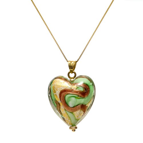 Painted in bold swirls of color, the 14k Yellow Gold Murano Glass Heart Necklace vividly accentuates your casual summer clothing. Handmade in Italy, this heart-shaped decorative glass dangles from an 18-inch yellow gold metal chain that fastens securely with a spring-ring clasp. This shimmering heart has a width of 2 millimeters.
